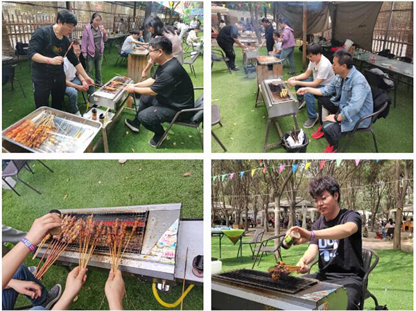 开场就是烧烤啦,本次活动踊跃出许多手艺备受赞誉的“烧烤师傅”。只见各位“烧烤师傅”们转动着手中的肉串并把握着肉的成熟度,熟练地进行刷油、翻烤,以及均匀加入孜然面、盐、辣椒面等调味料。不多时,一串串表面焦香内里滑嫩的烧烤串便制作完成。