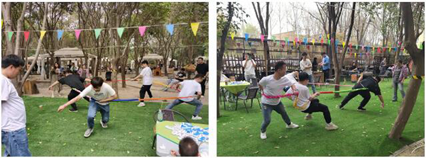 第二个游戏是东西南北跑,每组各选出2名组员分别背对背站在彩虹圈内,将乒乓球分别放置在4人对应方位的3-4倍距离,将彩虹圈放在腰间奋力拉动彩虹圈,最先拿到物品的组获胜本轮。共计玩3轮,取2胜为最终获胜。该游戏不光要靠力量牵制对手,更需要团队成员间的配合跟策略才能取得最终的胜利。本场游戏鲲鹏组顺利获得不断地沟通与及时调整策略取得了最终胜利。