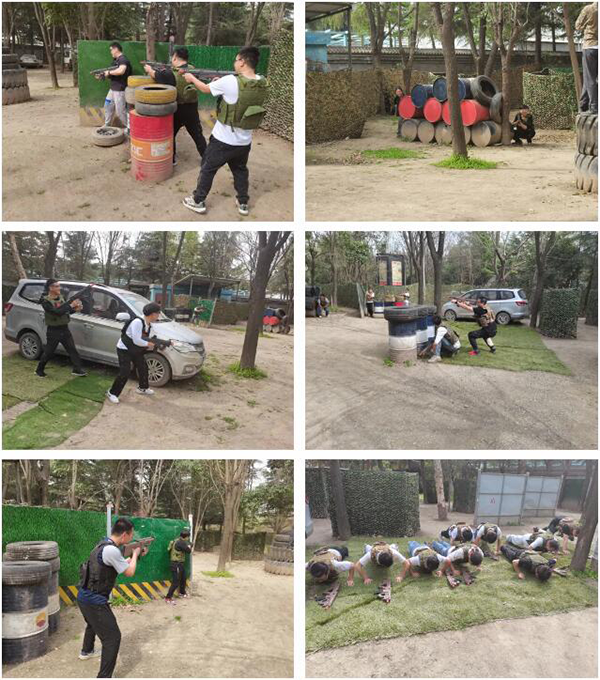休息过后便更换营地,开始我们最后的活动——真人CS对抗。裁判将大家分为两组,分别为“迷彩组”与“纯色组”。两组各自穿戴好护甲跟护目镜并手持装配了水弹的玩具枪站在场地的两头,顺利获得战略比拼与火力冲锋争夺场内中心的地盘。游戏中禁止撩枪即在掩体后只把手伸出去射击和移动或攀爬掩体,输的小组需要接受裁判的惩罚——俯卧撑。大家摩拳擦掌跃跃欲试,随着裁判的准备指令纷纷入场,顺利获得掩体跟地形遮挡住自己并展开激烈的对抗。