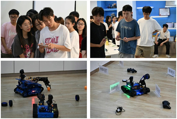 淘汰赛环节,在小组内紧密配合,各小组之间相互追逐、相互对抗。现场设置的赛道复杂,机器人在学生的操作下却灵活穿梭,跨越障碍、精准交接。选手操控表现沉着,意外状况也不慌,尽显科技魅力与团队协作。最终四支队伍突破重围,晋级决赛。